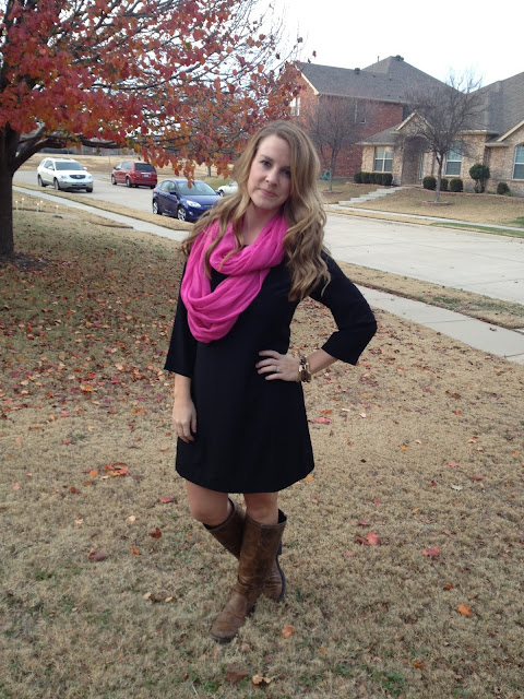 Cute outfit!! I like the black dress + pink scarf + brown boots. For some reason I can't seem to see or add to the link up this week, not sure if it's just my computer?
